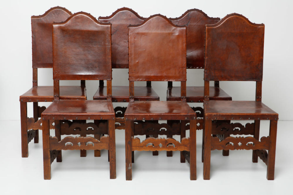 Em castanho, testeiras e travejamento recortados e vazados, com assentos e costas em couro com pregaria. Pequenos defeitos.