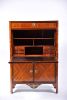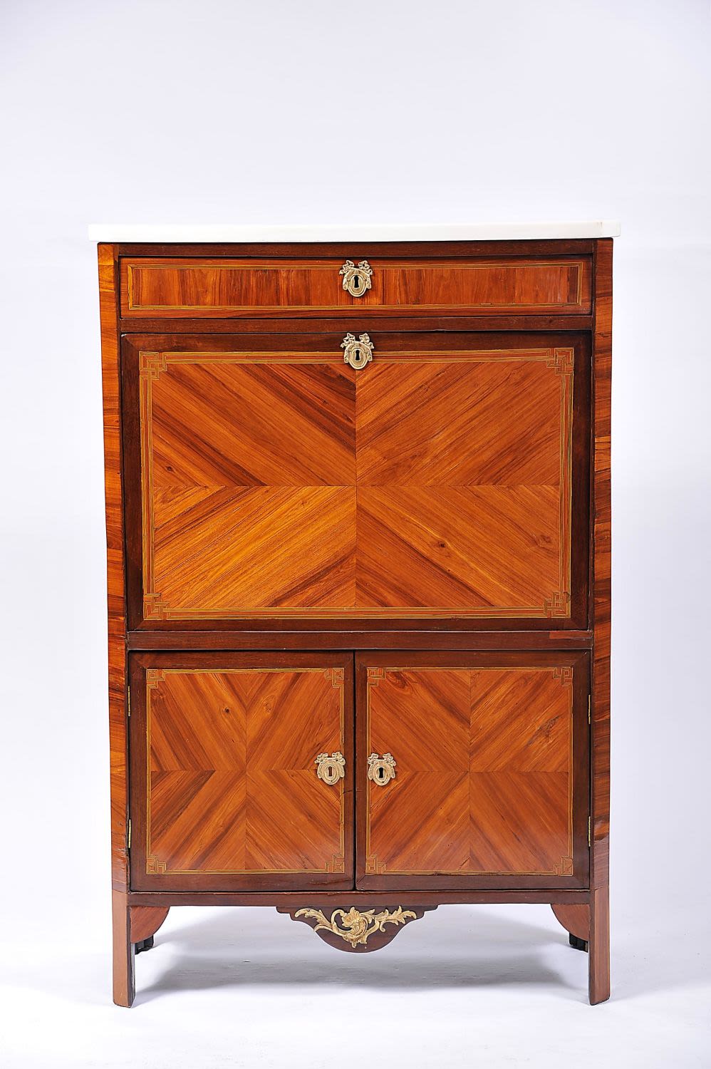 ferragens em bronze relevado e dourado, tampo de mármore, interior com prateleiras e gavetas, interior do tampo forrado a pele