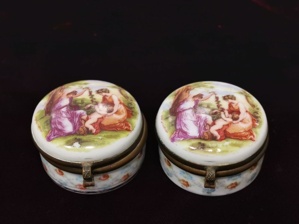 Par de caixas em porcelana antiga decoradas com figuras europeias