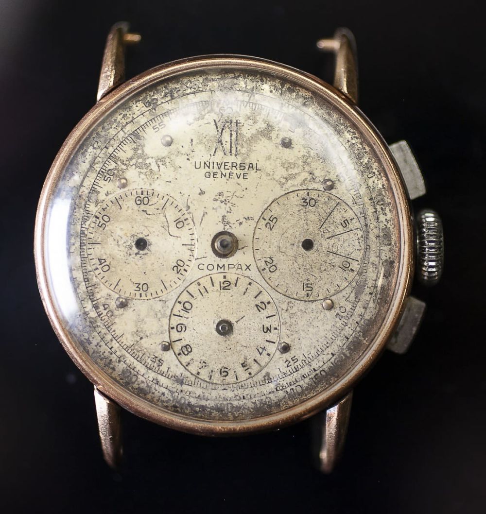 RELÓGIO UNIVERSAL GENEVE, PARTE SUPERIOR EM OURO 18 K, MACIÇA, E PARTE INFERIOR EM AÇO, PRECISA RESTAURO, 30,6 GRAMAS