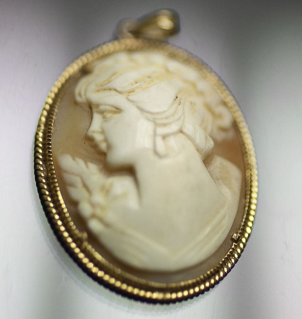 CAMAFEU DE MARFIM COM BORDA E ARGOLA EM OURO 18 K, 3 X 4 CM, 6,5 GRAMAS |