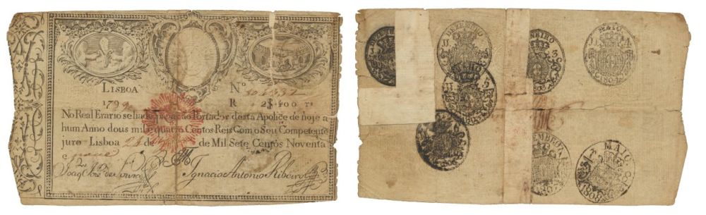 PAPEL. 2$400 Réis 1799. "9" manuscrito. Nº 804332. C/ carimbo D. Miguel. AMA 24M. REG.