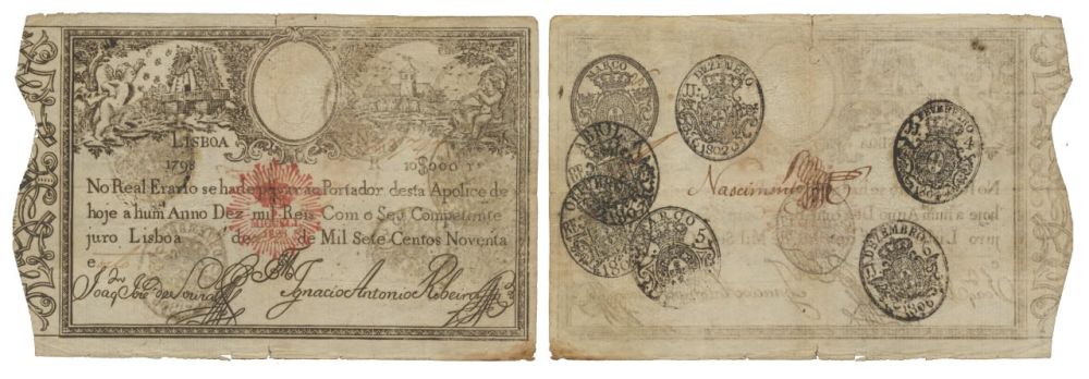 PAPEL. 10$000 Réis 1798. Nº 716747. C/ carimbo D. Miguel I. AMA 10 M. BC+.